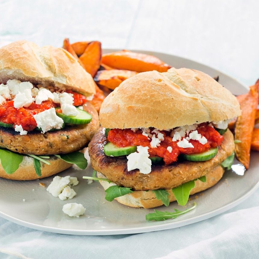 7. Doe wat rucola op de broodjes. Leg er een falafel burger op en verdeel wat plakjes komkommer, paprikapuree en feta over.