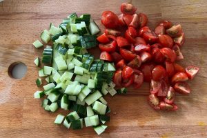 2. Doe de gemende sla in een grote kom. Was de cherrytomaatjes en de komkommer. Snijd de cherrytomaatjes in kwarten en de komkommer in blokjes. Voeg toe aan de kom.