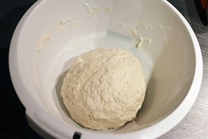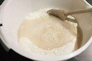 1. Doe de bloem in een kom en voeg het gist toe. Maak een kuil in het midden en voeg het warme water daarin toe. Kneed het deeg tot een egale bol en leg in de kom. Dek de kom af met een iets vochtige doek en zet hem op een redelijk warme plek in het huis (bij de verwarming bijvoorbeeld). Laat 1 uur rijzen.