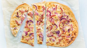 Bak de flammkuchen in 12 minuten goudbruin en knapperig. Let op: elke oven is anders, dus houd de laatste paar minuten goed in de gaten.