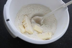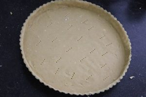 2. Bestrooi een werkvlak met een beetje bloem. Druk het deeg met je handen wat plat. Bestrooi ook de bovenzijde met een beetje bloem en rol het deeg verder uit met een deegroller tot hij een paar cm groter is dan de bodem van de bakvorm. Vet de bakvorm in met een beetje boter. Verdeel de lap deeg (met behulp van je roller) over de bakvorm. Mocht het deeg scheuren kun je het makkelijk weer aan elkaar drukken. Snijd het overige deeg van de randen en prik met een vork gaatjes in de bodem.
