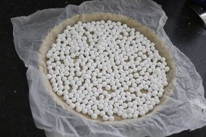 3. Maak een stuk bakpapier iets vochtig en kreukel het op tot een bal. Vouw weer uit elkaar en leg op de bodem. Verdeel hier de steunvulling op. Zet dit 15 minuten in de oven. Haal de bakvorm daarna uit de oven, verwijder de steunvulling en het bakpapier en bak de vorm nogmaals 15 minuten in de oven.