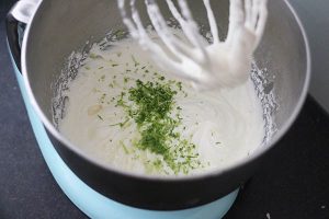 4. Laat de bodem afkoelen. Mix de slagroom lobbig en voeg dan de mascarpone toe en mix tot een stevig roommengsel. Rasp de limoen en pers hem uit. Voeg het limoensap, rasp en poedersuiker toe aan de room en mix erdoor. Verdeel de limoenroom over de bodem zodra deze geheel is afgekoeld.