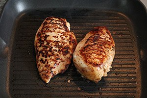 2. Snijd de perzik in dunne partjes en grill ze in de grillpan totdat ze mooie grillstrepen hebben. Leg dan de kipfilets in de grillpan en grill ze vanuit beide kanten gaar. Snijd ze als ze klaar zijn in plakjes. Snijd de cherrytomaatjes doormidden en de avocado in plakjes. Verdeel de sla over 2 borden en verdeel leg de perzikpartjes, mozzarellaballetjes, avocado en cherrytomaatjes erover. Leg dan de plakjes kip erover. Besprenkel tenslotte met de dressing.