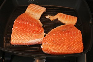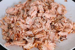 1. Besprenkel de zalm met wat olijfolie, peper en zout. Bak gaar in de grillpan. Trek dan de zalm met 2 vorken uit elkaar tot pulled salmon.