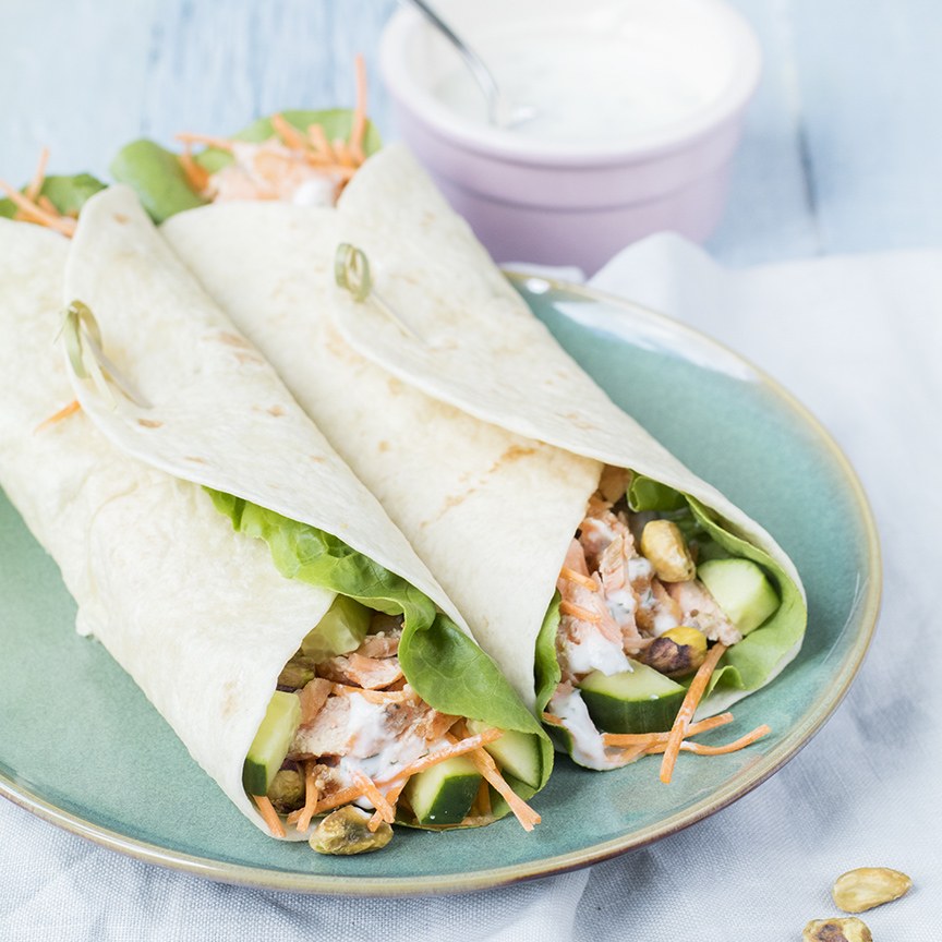 2. Verdeel wat sla en wortel over de wraps, met daaroverheen de pulled salmon en komkommer. Maak af met het yoghurtsausje en wat pistachenootjes.