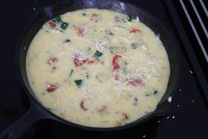 5. Giet dan het eimengsel erover en en bak de onderzijde een paar minuutjes en zet de pan dan 25 minuten in de oven op 200° graden. Snijd als de frittata goed gestold is deze in punten.