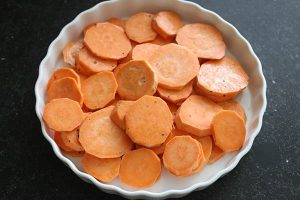 2. Schil (optioneel) en snijd de zoete aardappels in plakjes van ca. 2 à 3 mm dik.