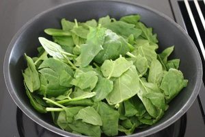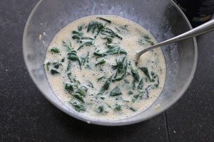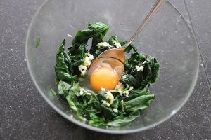 4. Bak ondertussen de spinazie in een pan tot deze geslonken is. Laat de spinazie goed uitlekken en doe deze vervolgens in een kom. Klop de eieren erbij met de uitgeperste knoflook, melk, peper en zout.