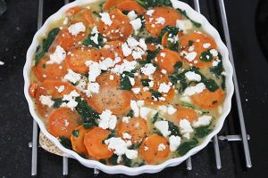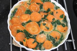 5. Haal de zoete aardappelschijfjes uit de oven en verdeel mooi over de schaal. Giet het eiermengsel met spinazie er over. Schep eventueel een beetje door.