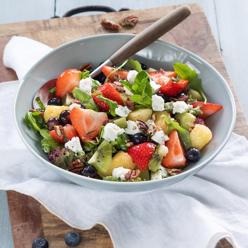 5. Schep als laatste de sla er door. Garneer de fruitsalade met wat geitenkaas en pecannoten en een takje munt.