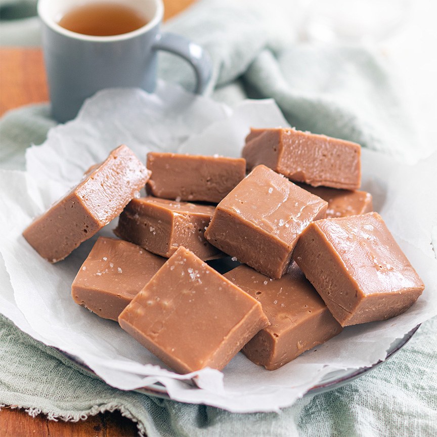 3. Laat de fudge minimaal 2 uur opstijven in de koelkast. Snijd er daarna met een scherp mes chunks van. Bewaar de fudge in de koelkast.