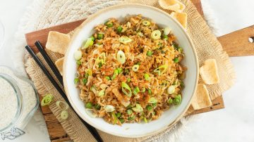 8. Schep de kimchi rijst op borden en serveer met de spiegeleieren. Garneer met extra bosui en wat sesamzaadjes.