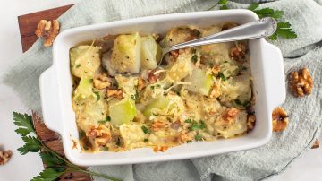 4. Tip: voeg ook eens wat walnoten toe aan de bloemkool voordat hij de oven gaat. Of bestrooi de bovenzijde met wat paneermeel voor een krokant korstje.
