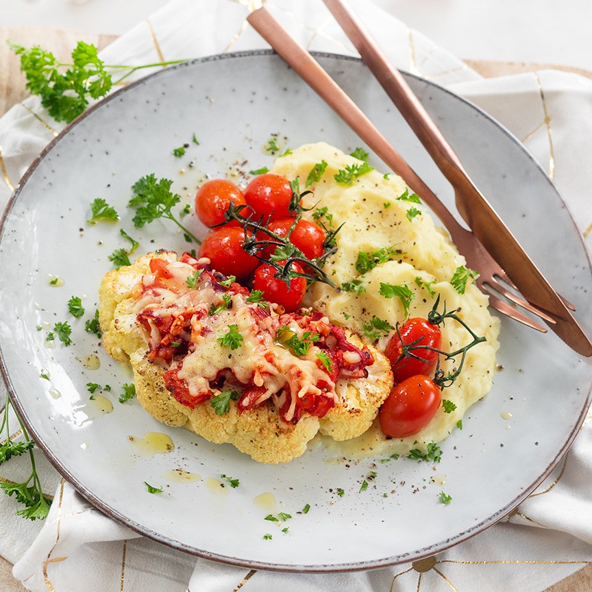 9. Verwarm of bereid de aardappelpuree. Maak de borden op. Schep wat aardappelpuree hierop en smeer iets uit met een lepel. Leg er een gegratineerde bloemkool steak bij. En een takje met wat cherrytomaatjes. Bestrooi het geheel met peterselie. En besprenkel met een klein beetje olijfolie.