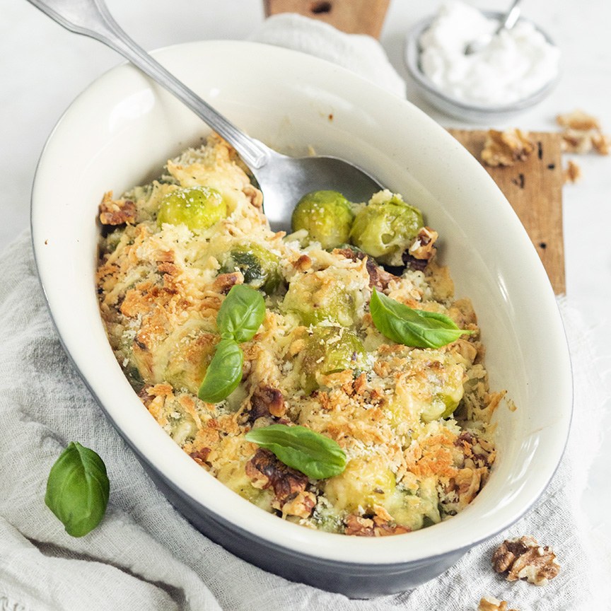 8. Zet de ovenschotel met spruitjes ca. 20 minuten in de oven. Eventueel kun je de laatste paar minuten de grill aanzetten.