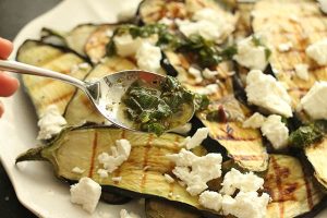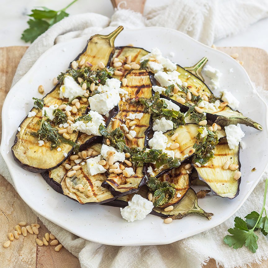 6. Leg de gegrilde aubergine op een bord, bestrooi met feta en besprenkel met de dressing. Bestrooi als laatste met de geroosterde pijnboompitten. Serveer direct.