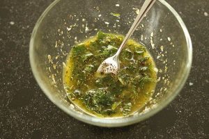 3. Meng de olijfolie, citroenrasp en sap, knoflook, oregano, peper, zout en fijngesneden munt door elkaar.