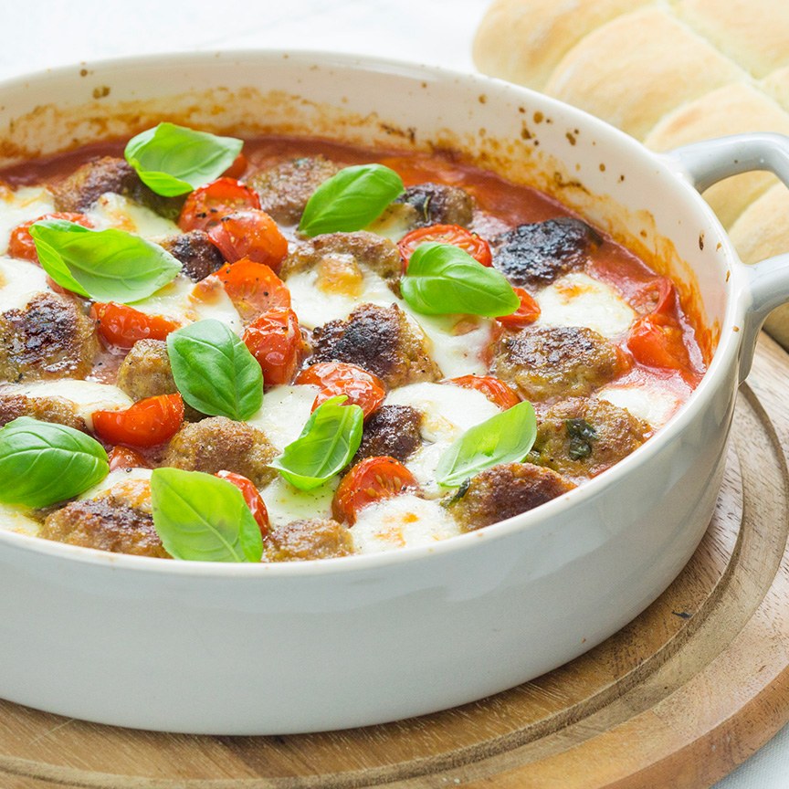 3. Snijd de tomaatjes en mozzarella klein en verdeel tussen de gehaktballetjes. Zet de ovenschaal ca 25 minuten in de oven. Zet eventueel de laatste paar min de grill aan voor een mooi bruin korstje. Leg er voor het serveren wat verse basilicum op. Lekker met wat brood of pasta.