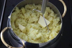 1. Verwarm de oven op 200 graden. Snijd de aardappels in grove stukken. Snijd van 1 appel een paar mooie ringen, bewaar deze, en schil de rest van de appels en snijd in stukjes. Pel de ui en snijd in stukjes. Verhit een pan met water op het vuur. Voeg de aardappels, ui en stukjes appel toe. Kook ca. 15 tot 20 minuten tot de aardappels gaar zijn.