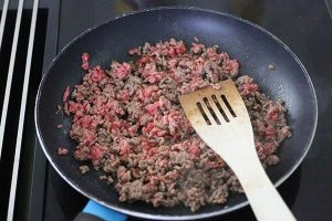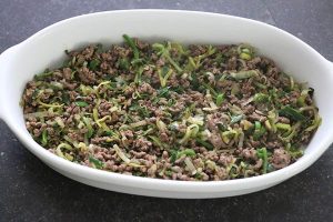 2. Bak ondertussen het gehakt in een koekenpan met een beetje boter of margarine. Voeg de prei toe en een flinke snuf kerrie en breng op smaak met peper en zout. Doe het gehaktmengsel in een ovenschaal.