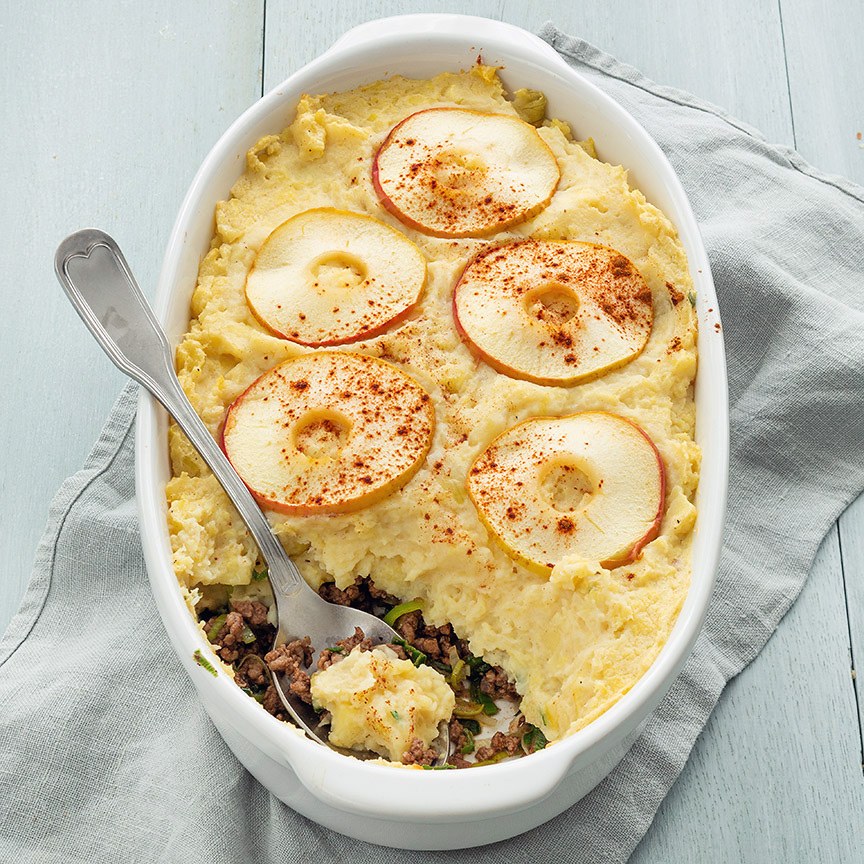 Deze ovenschotel met hete bliksem en gehakt is een lekkere variatie op de klassieke stamppot. Een laag kruidig gehakt met daarboven een smeuïge puree van aardappel en appel, net zoals in mijn basisrecept voor hete bliksem. Ideaal als je net iets anders wilt, maar wel die vertrouwde smaken.