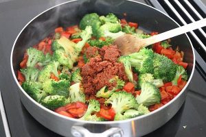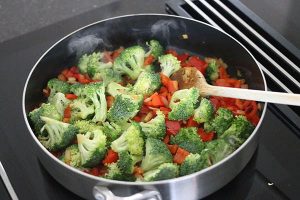 1. Snipper de ui fijn en fruit aan in een grote wokpan of hapjespan met een beetje olie. Snijd de broccoli in kleine roosjes en voeg toe aan de pan. Hak de puntpaprika in blokjes en bak ook mee in de pan.