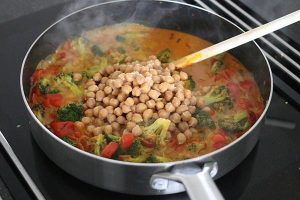 2. Doe dan de currypasta erbij en roerbak een paar minuutjes. Giet de kokosmelk erbij. Laat de gele curry ca. 15 tot 20 minuutjes zachtjes garen, voeg halverwege de uitgelekte kikkererwten erbij.