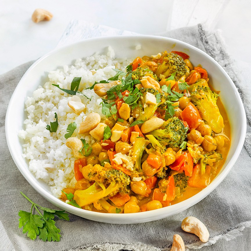 3. Kook de bloemkoolrijst gaar in ca. 2 minuten en giet af. Serveer de gele curry met de bloemkoolrijst. Garneer met cashewnoten en koriander.