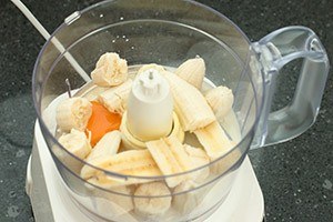 1. Verwarm de oven voor op 200 graden. Meng het speltmeel, zelfrijzend meel en het bakpoeder in een kom door elkaar. Mix in de keukenmachine het ei, de melk, honing en de bananen. Houd 2 in de lengte doorgesneden plakjes banaan apart, die heb je straks nog nodig. Giet het beslag dat je zojuist in de keukenmachine hebt gemixt bij het meelmengsel en meng tot een stevig beslag.