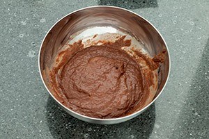 2. Verdeel het beslag over 2 kommen. Voeg aan één kom de cacao en 6 eetlepels water toe en blijf roeren tot het een egaal mengsel is geworden. Vet de cakevorm in met olijfolie. Neem vervolgens om en om een aantal eetlepels van het lichte en het donkere beslag en vul hiermee de vorm tot het beslag op is.