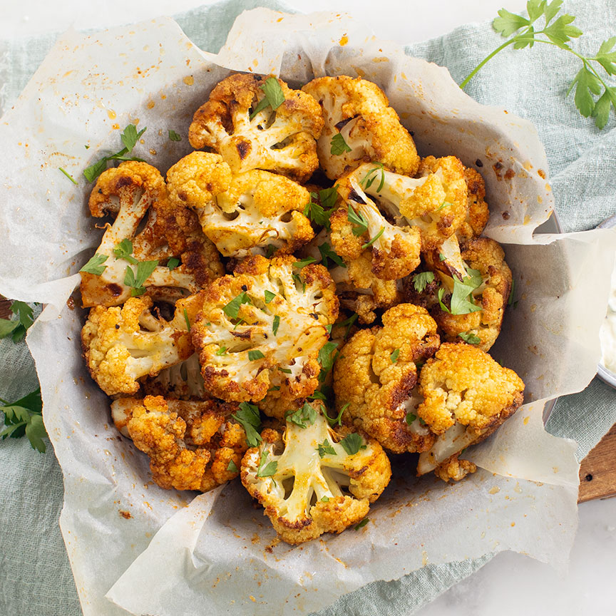 5. Haal de bloemkool uit de oven en bestrooi met verse peterselie. Serveer direct als bijgerecht of gezonde snack.