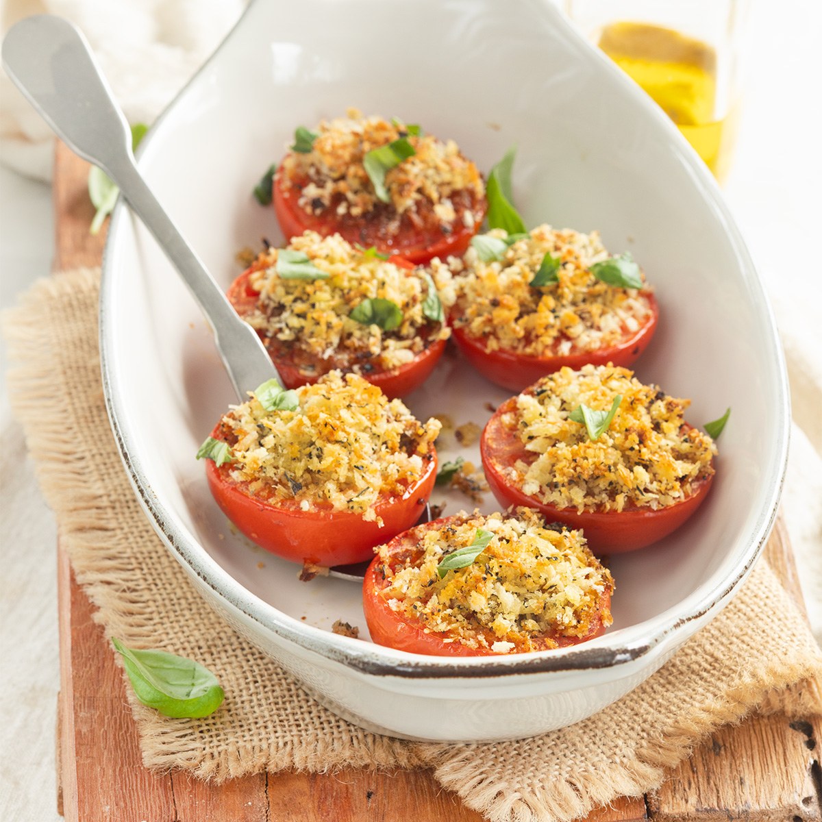 4. Verdeel het panko-mengsel over de tomaten en bak de tomaten ca. 25 minuten in de oven.