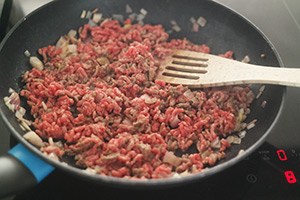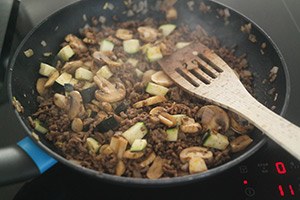1. Verwarm de oven op 200 graden. Snipper de ui en fruit deze aan in een pan. Voeg het gehakt toe en rul dit bruin. Snijd de courgette en champignons klein en bak mee met het gehakt. Voeg de kruiden toe en daarna de tomatensaus. Laat 10 min pruttelen.