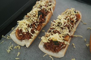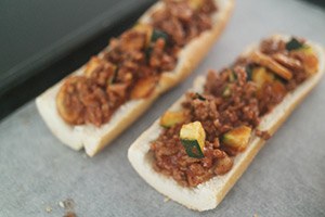 2. Snijd het stokbrood in drieën en daarna door de lengte doormidden (of ander gewenst formaat). Verwijder een beetje van het zachte brood en leg ze op de bakplaat. Vul ze met het gehaktmengsel. Bestrooi met pijnboompitten en wat kaas. Bak de gevulde stokbroodjes ca. 15 min in de oven. Garneer met wat basilicum.