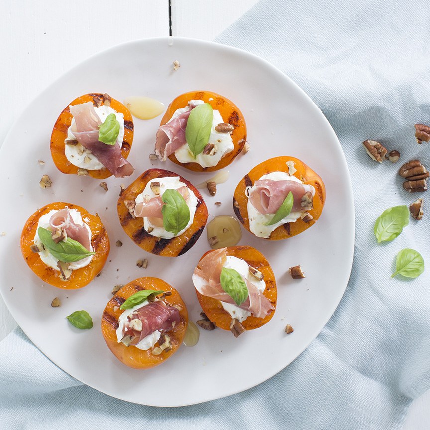 1. Halveer de abrikoosjes en verwijder de pit. Bestrijk de snijzijde met een beetje olie en grill ze in een grillpan tot er mooie donkere strepen te zien zijn. Vul ze met een theelepel mascarpone.