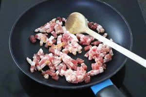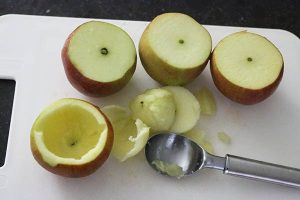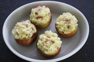 1. Verwarm de oven op 200 graden. Snijd de bovenzijde van de zure appels en bewaar dit kapje. Hol de appel verder uit en bewaar het vruchtvlees. Besprenkel eventueel de uitgeholde appels met citroensap om verkleuren tegen te gaan. Snijd de aardappels in grove stukken. Schil de zoete appel, pel de ui en snijd beide in stukjes. Verhit een pan met water op het vuur. Voeg de aardappels, ui, stukjes zoete appel en de helft van de stukjes zure appel (uit de uitgeholde appels) toe. Kook ca. 15 minuten tot de aardappels gaar zijn. Bak ondertussen de spekjes krokant in een droge koekenpan.