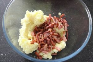2. Giet de aardappels en appels af en doe terug in de pan. Pureer met een stamper fijn en maak de stamppot smeuïg met een klont boter en melk. Meng de spekjes door de hete bliksem en breng op smaak met peper, zout en een snufje kaneel. Vul de zure appels met de hete bliksem. Zet de gevulde appels ongeveer 20 minuten in de oven.