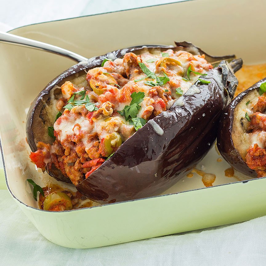 2. Snijd de olijven in ringetjes en schep als laatste door het gehakt mengsel. Haal de aubergines uit de oven. Snijd deze net niet helemaal doormidden en vouw open. Schep het gehaktmengsel er tussen. Bestrooi met kaas en zet nogmaals 15 minuten in de oven. Bestrooi voor het serveren met wat fijngehakte peterselie.