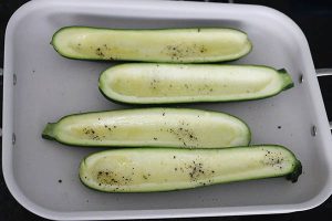 4. Leg de courgettes in een ovenschaal en bestrijk of besprenkel met een beetje olie en bestrooi met een snufje peper en zout.
