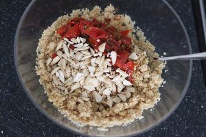 7. Snijd de gedroogde tomaatjes en amandelen in stukjes en roer door de couscous samen met de verkruimelde feta en fijngehakte peterselie.