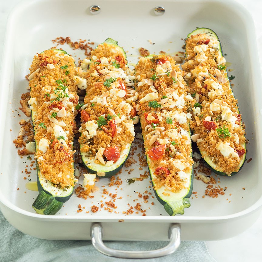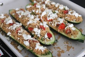 8. Haal de courgettes uit de oven en vul ze met het couscousmengsel. Verdeel eventueel nog een beetje extra feta bovenop en zet nog 10 minuten in de oven zodat ook de feta lichtjes wordt gebakken.