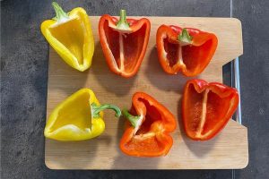 3. Snijd de paprika’s in de lengte doormidden en verwijder de zaadjes.
