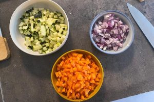2. Snijd de ui fijn en de wortel en courgette in kleine blokjes.
