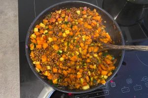 7. Voeg de laatste 3 minuten de bruine linzen toe en verwarm deze mee met de groenten.