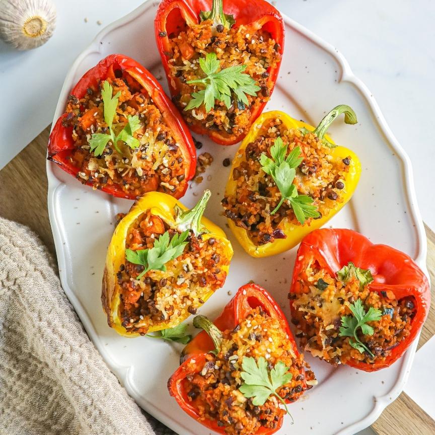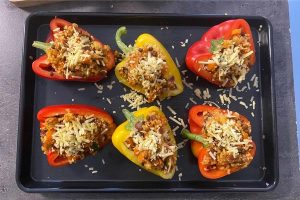 9. Leg de paprika’s op een bakplaat en vul de met de bulgur-groenten mix. Verdeel er vervolgens wat vegan geraspte kaas overheen en zet de bakplaat vervolgens in de oven. Bak de paprika’s nog zo’n 20 minuten.
