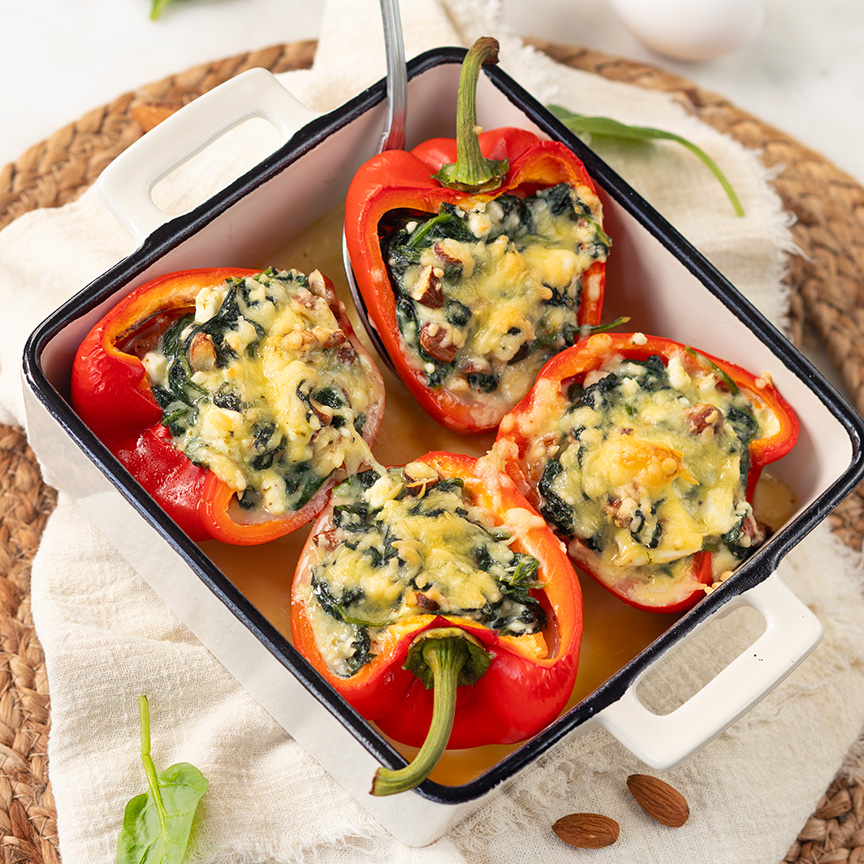 5. Vul de paprika’s met het spinaziemengsel, en bestrooi de bovenzijde met de rest van de geraspte kaas.