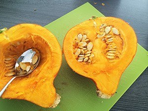 2. Halveer de pompoen en schraap de pitten en draden er uit. Leg ze op een bakplaat, besprenkel met olie en bestrooi met peper en zout en zet ze 25 min. in de oven.