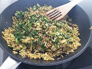 5. Voeg de andijvie toe en laat slinken. Schep de freekeh en de rozijnen er door. Breng het mengsel op smaak met komijn, peper en zout.