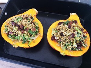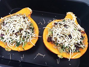 6. Schep de vulling in de pompoenen en bestrooi met kaas. Zet de gevulde pompoenen nogmaals 15 minuten in de oven tot de kaas gesmolten is.